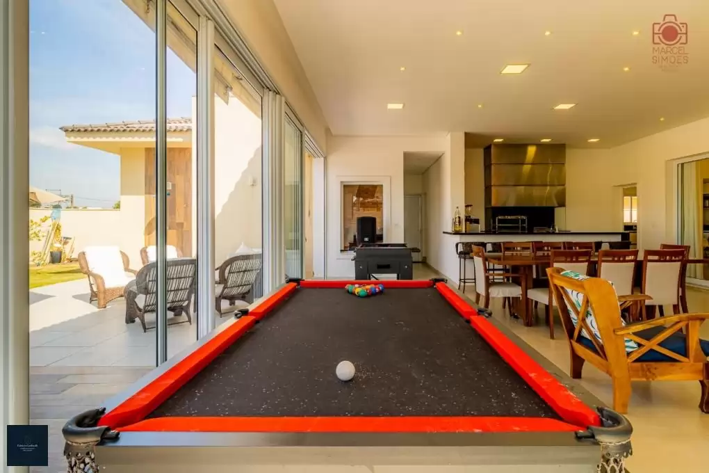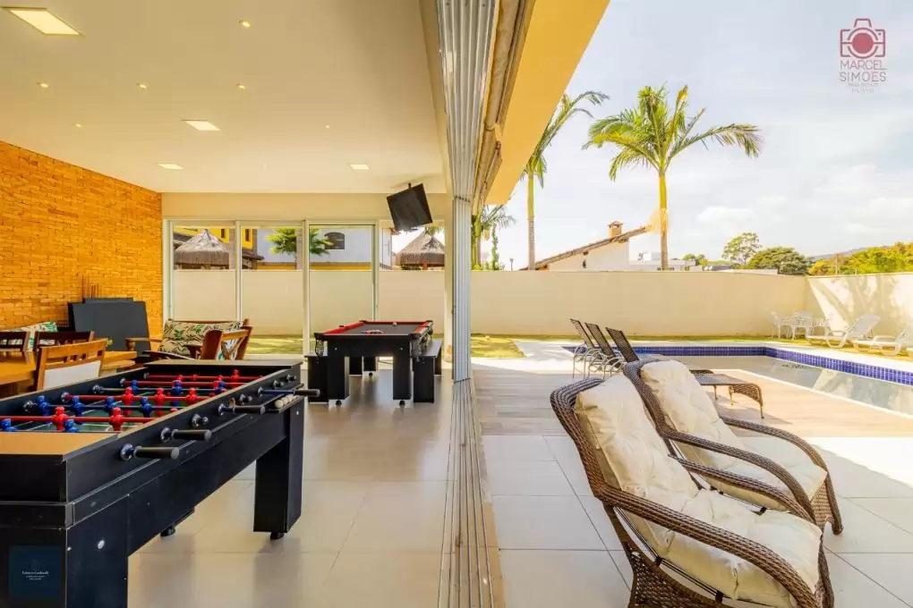 - Salão de festas com abertura e fechamento total de vidros, com mesas de jogos (pebolim e mesa 3em 1sinuca com tampo para pingue-pongue e bancos para servir como mesa);