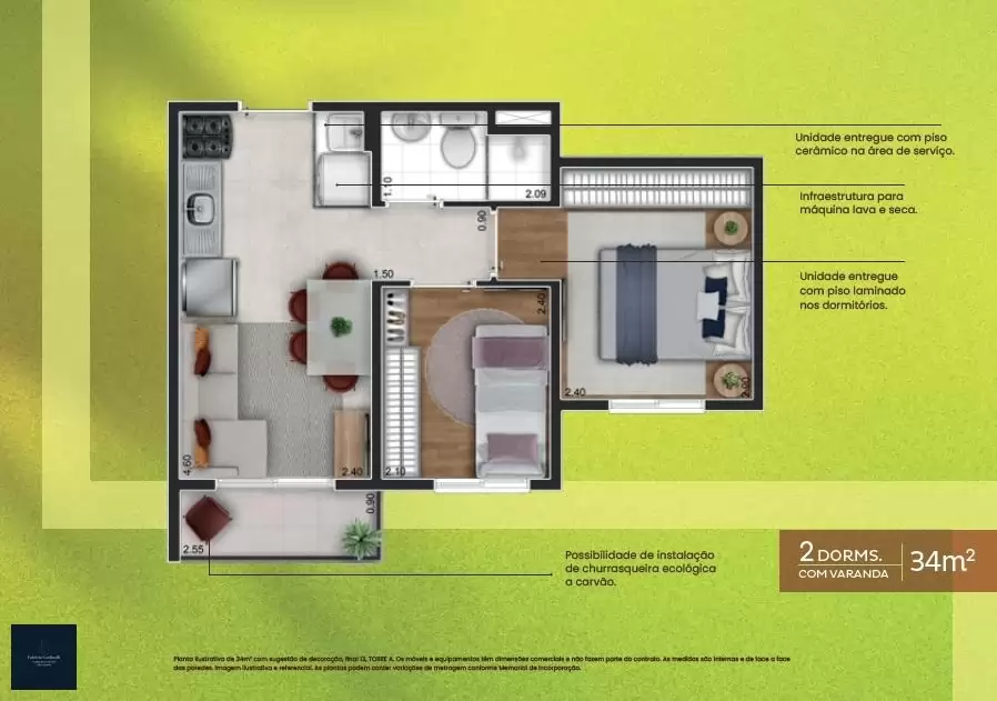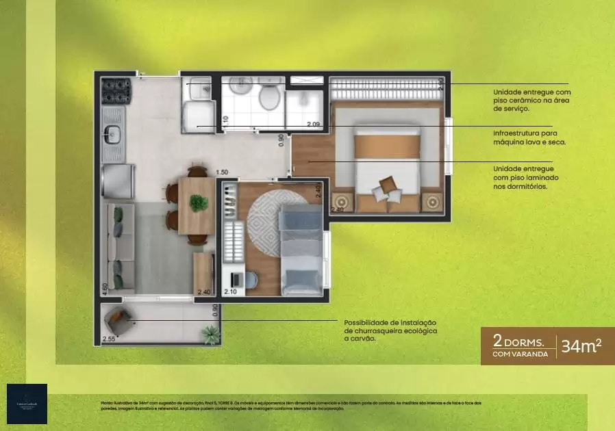 34m² ? 02 dormitórios, com varanda, sem vaga.